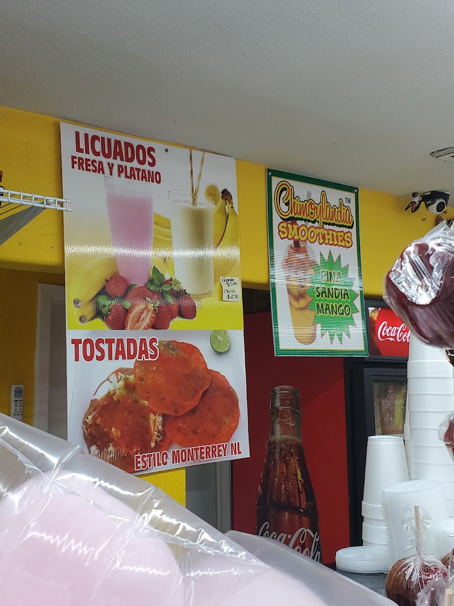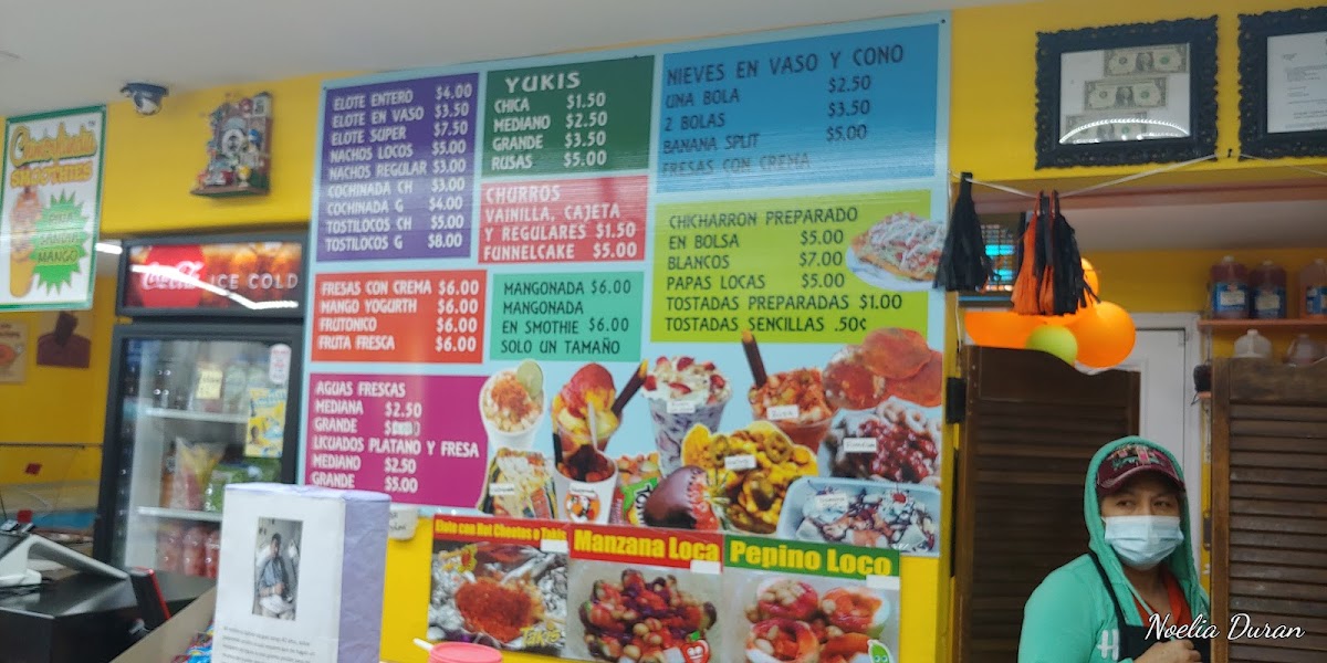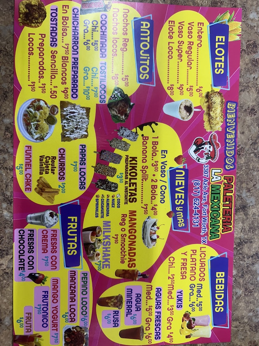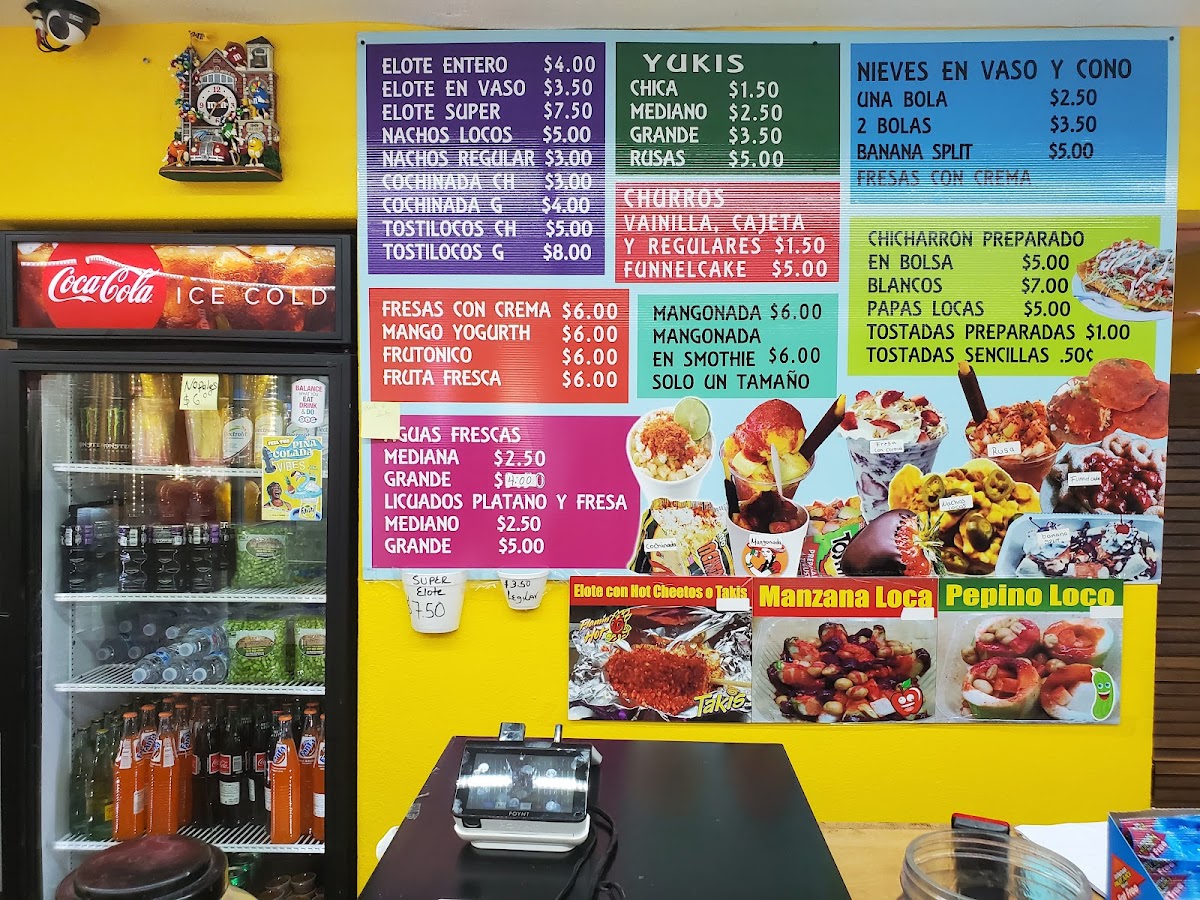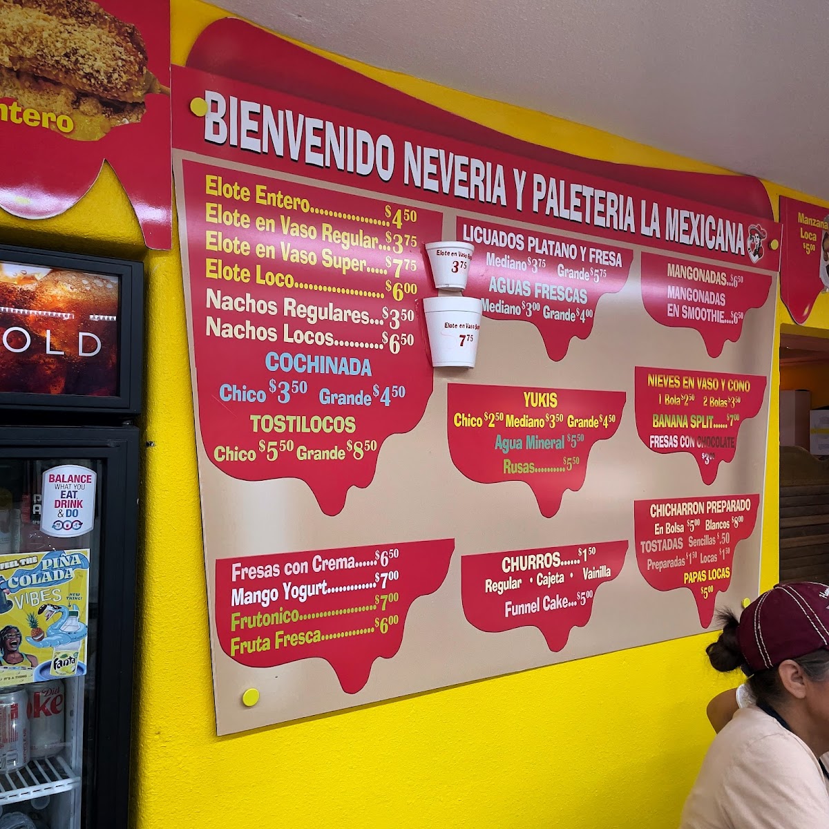 The menu also highlights a variety of popular sweet treats, including different types of ice cream and paletas (Mexican popsicles), as well as specialty items like mangonadas and cotton candy. Corn in the cup, offered with traditional toppings, is a notable savory snack option.